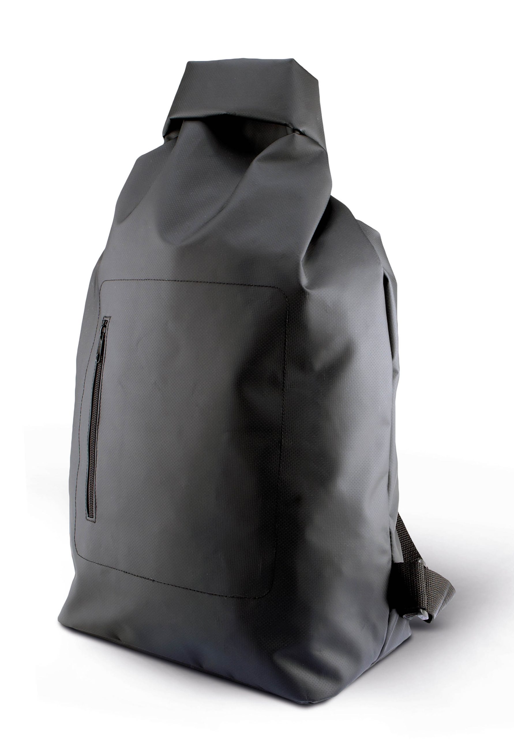 Sac marin en toile imperméable tarpaulin, fermeture haut du sac avec boucle, bretelles/sangles ajustables, poche devant avec zip imperméable. Zips SBS. Capacité 42L