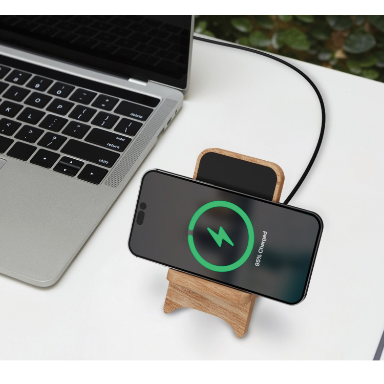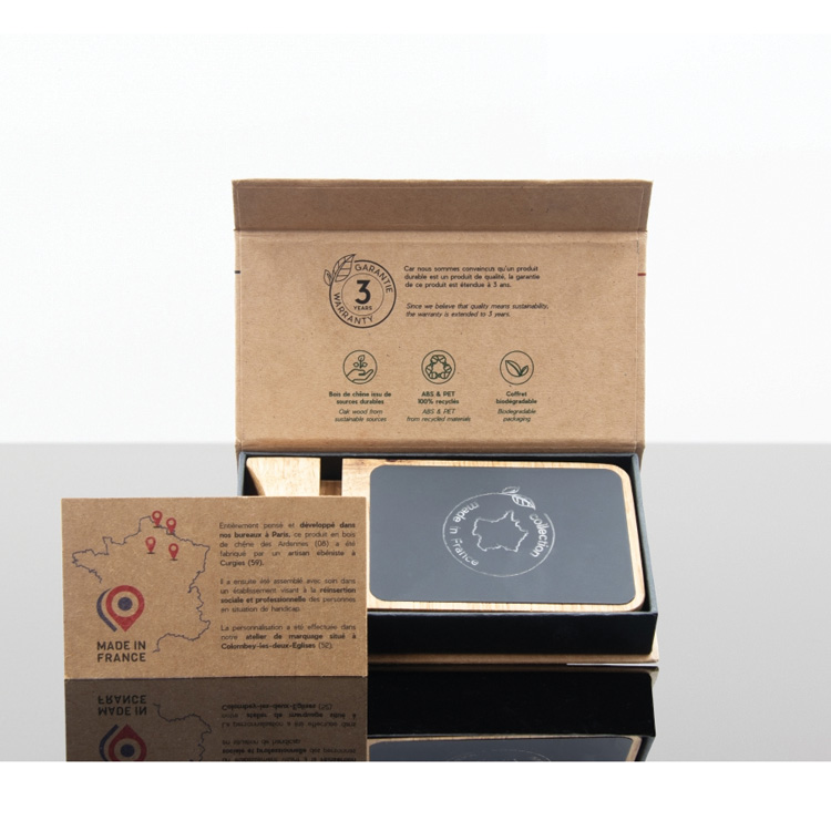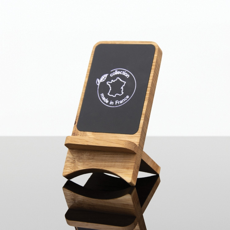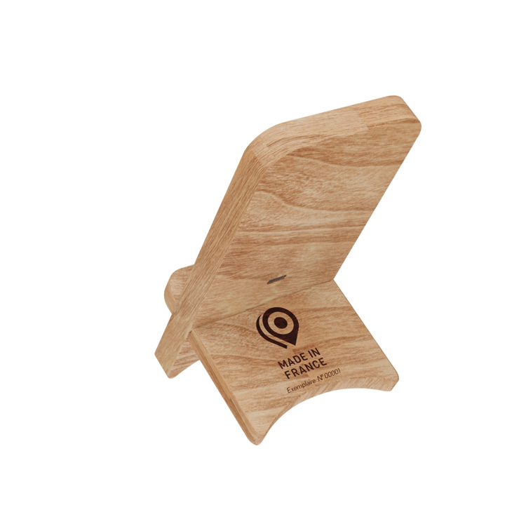 Ce support à chargement induction 10W Made in France en bois de chêne français, assemblé et personnalisé en France.