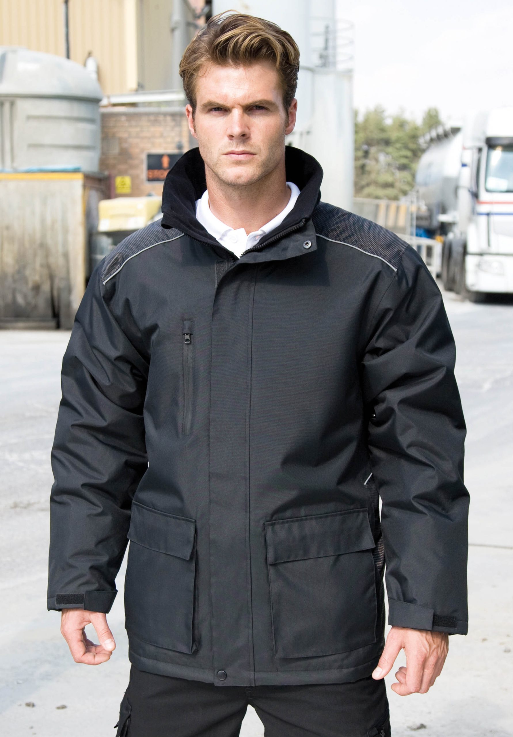 Extérieur : 300D polyester oxford enduit PVC. Doublure : 210T polyester taffeta. Isolation : rembourrage polyester. Imperméable à 2000mm. Coupe-vent. Doublure damassée en losanges. Fermeture zippée 2 directions à l’avant avec rabat de protection fermé par Velcro® et boutons pression. Col doublé en tricot. Capuche ajustable et amovible par zip. Empiècements contrastés en tissu Dobby. Passepoil réfléchissant. Multi poches : poches avant plaquées à fermeture Velcro®, poches latérales chauffe-mains, poche poitrine intérieure. Ourlet réglable par cordon de serrage. Poignets côtelés avec réglage par fermeture Velcro®. Tirettes amovibles sur toutes les fermetures zippées (4 coloris de tirette fournis).