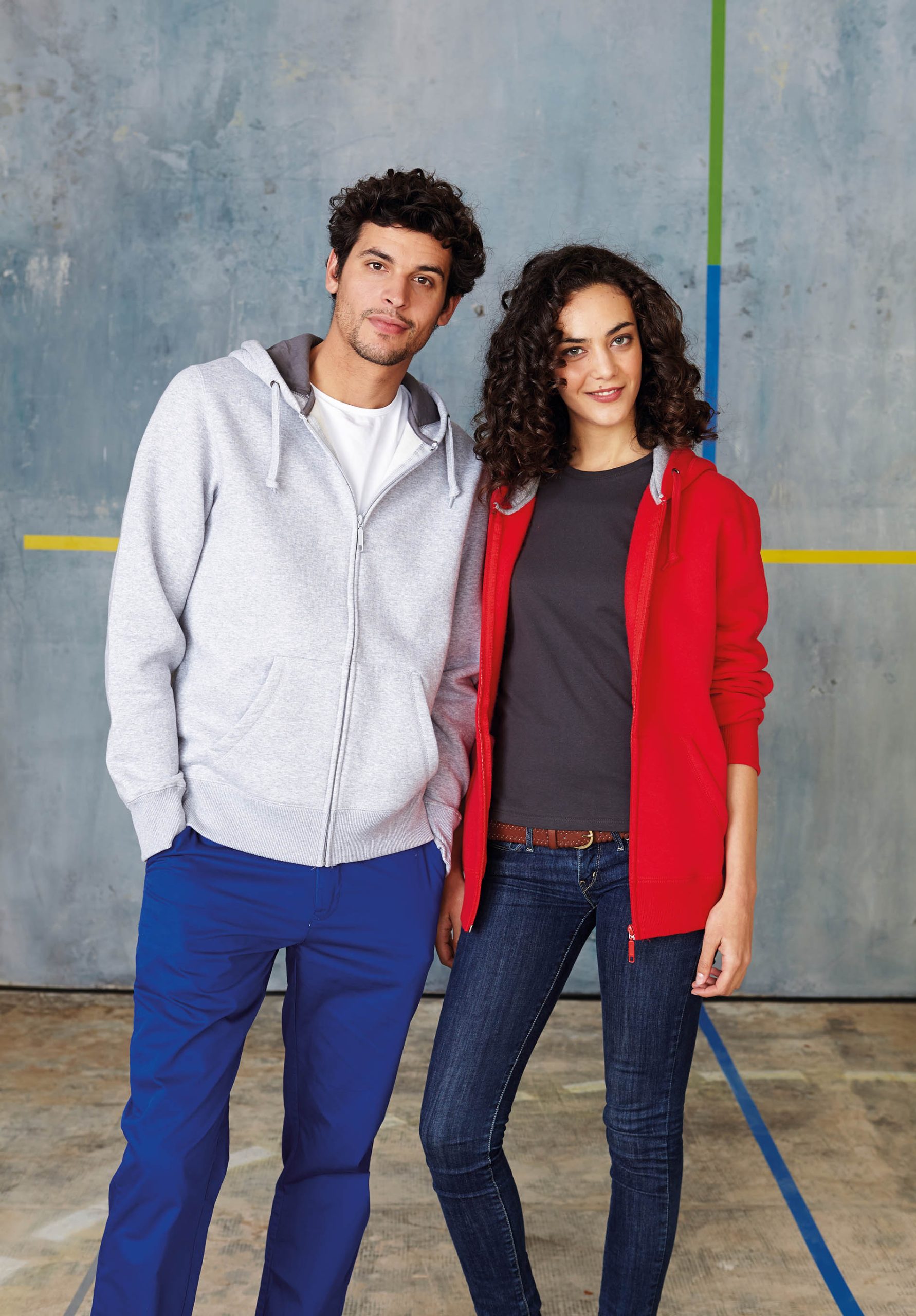 Coton et polyester « LSF ». Molleton gratté et pré-rétréci. Lavage siliconé. Bande de propreté contrastée à l’encolure. Intérieur capuche contrasté Dark Grey pour le coloris Oxford Grey et Heather Grey pour tous les autres coloris. Poches kangourou. Finition bord-côte bas de manche et bas de vêtement. Zip YKK®.