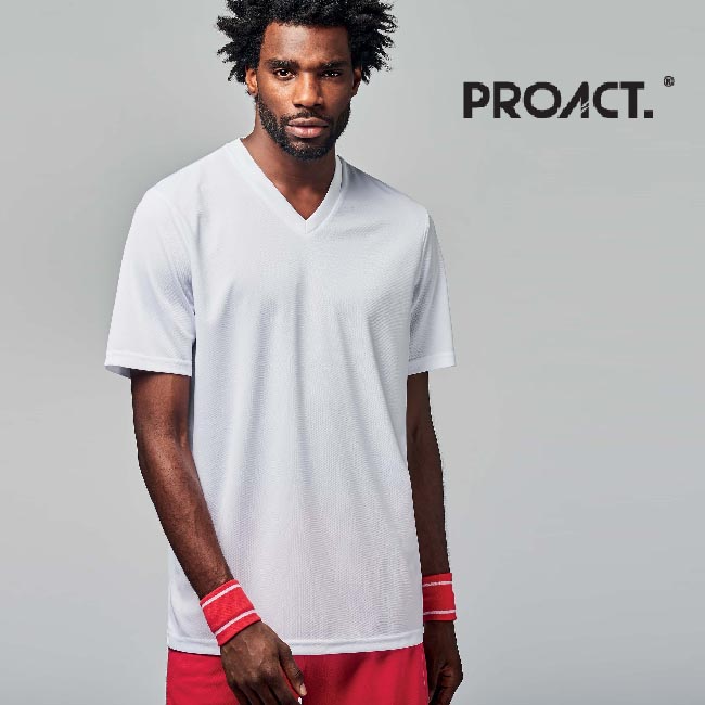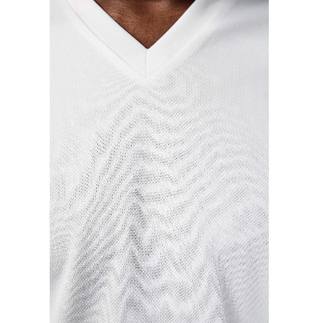 Polyester. Tissu à séchage rapide. Col V bord-côte. Finition double aiguille au bas du vêtement et manches. Idéal pour la sublimation.